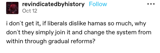 I’m not endorsing the atrocities, but at least Hamas are committing them in the name of liberation as opposed to on behalf of the occupation forces of a fascist apartheid state.