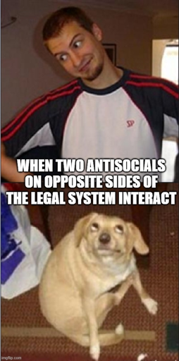 A young white man who looks like he could be a cop, with hands on his hips, looking down with an expressive face of lighthearted judgment. Looking up at him is a silly dog with an equally expressive face of ironic bashfulness. Over-layed text reads: “When two antisocials on opposite sides of the legal system interact”